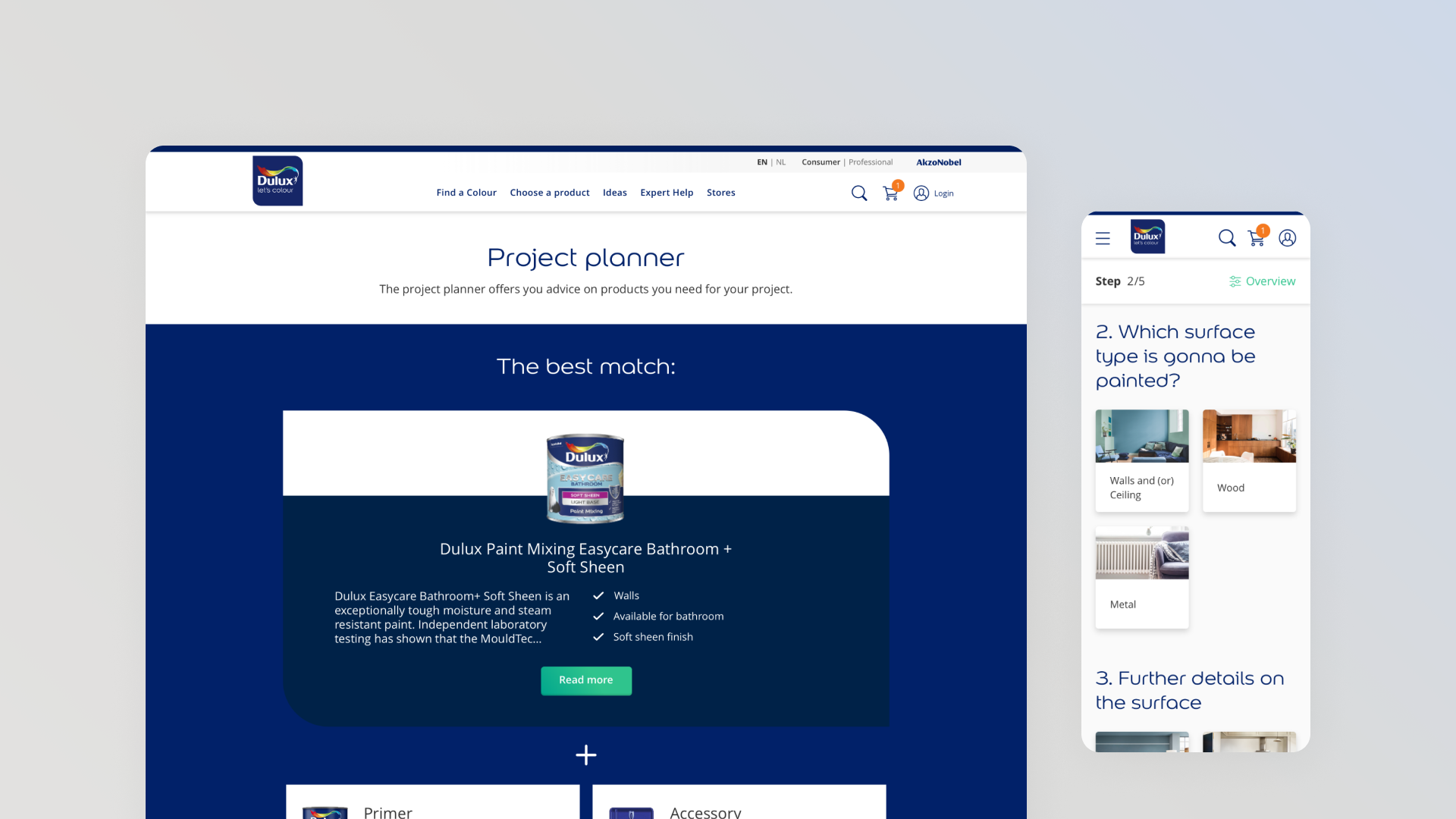 What began as a project evolved into a wider transformation with new multi‑brand experiences that support AkzoNobel customers globally in all things paint. The digital tools we designed help people and professionals in more than 50 countries quickly find the right products and information, whether planning a large commercial job or repainting a bedroom. By standardising assets and components, approximately 60% of brands in the portfolio now run on the same UX and UI system.